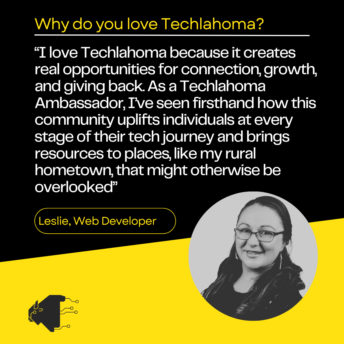 Leslie Merritt, A web developer and technical project manager from Tecumseh, Oklahoma shares her thoughts on our organization, our mission, and her experience as a Techlahoma Ambassador. We appreciate Leslie for her tremendous support and the value she brings to our community! 💙 🦬
