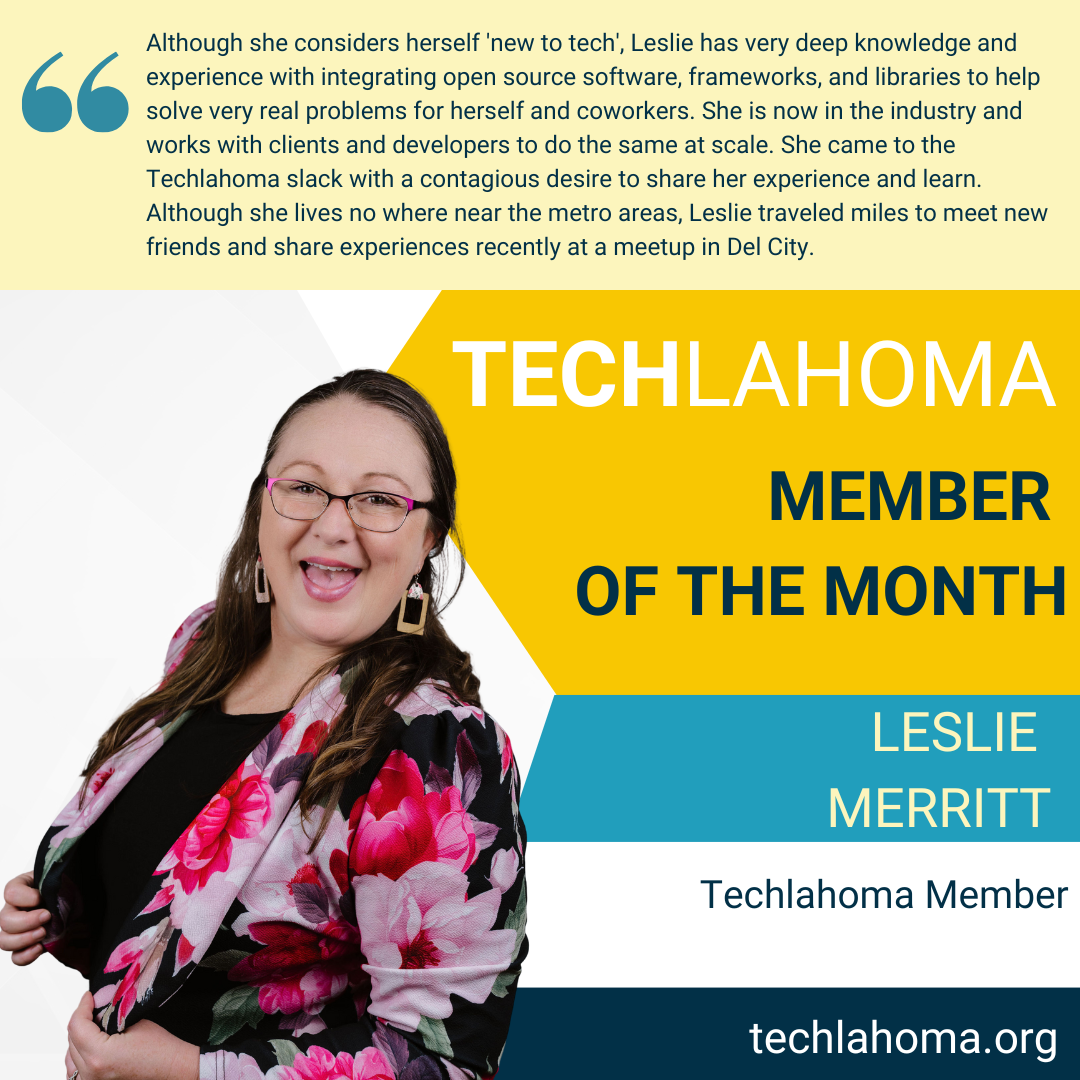 🌟 Congratulations to Techlahoma’s November Member of the Month, Leslie! 🌟 Although she considers herself “new to tech,” Leslie’s impact tells a very different story. She has a remarkable ability to integrate open-source software, frameworks, and libraries to solve real-world problems for herself,...Read more